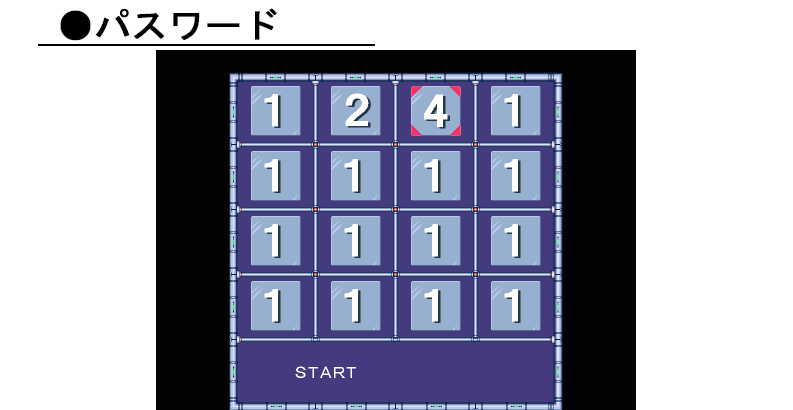 パスワード作成 パネルの上でボタンを押すと番号が進みます 決定ボタンでパスワード確定で、パスワードが合っていれば、ボスセレクトへ移行します。 |