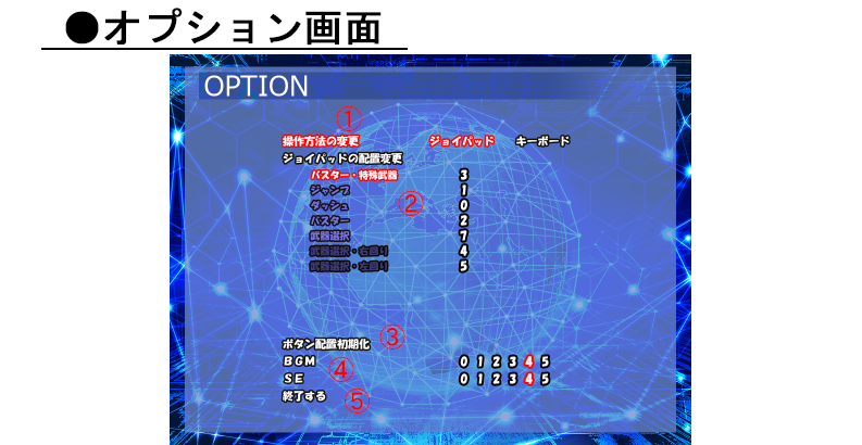 ①操作方法の変更 ジョイパッドかキーボードか選択できます。 ジョイパッドがささっていない場合、ジョイパッドは選択できません。 ②ボタン配置の変更 ボタン配置を変更できます。 ③ボタン配置を初期化 ボタン配置をデフォルトに初期化します。 ④武器クイックチェンジon/off 武器のクイックチェンジを使用するか否か選択できます。 ⑤音量調整 音量を5段階で調整できます ⑥終了する タイトイルへ戻ります。 同時に、ボタン配置が保存されます。 |