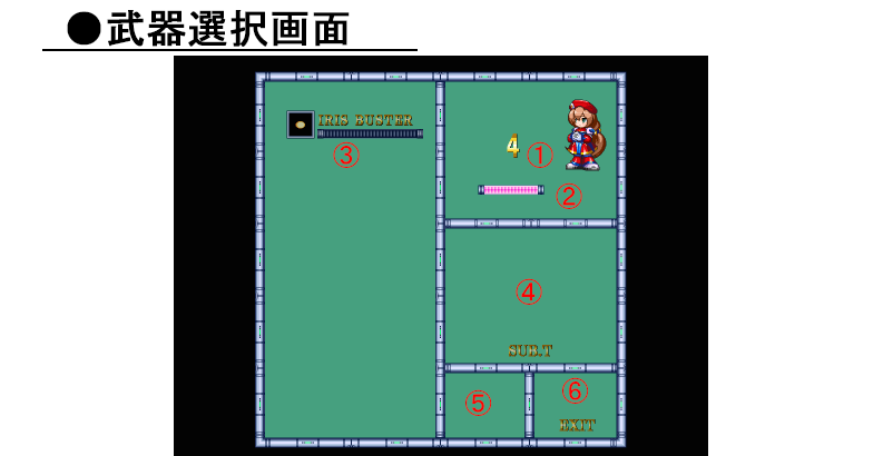 ①アイリスのライフエネルギー 0になると1ミスになります。 ②アイリスの武器エネルギー 必要量以下になると特殊武器は使えません。 ③ボスのライフエネルギー 0するとステージクリアです。 ④アイリス 自機です。 ⑤ボス ステージを守っているボスです。 |